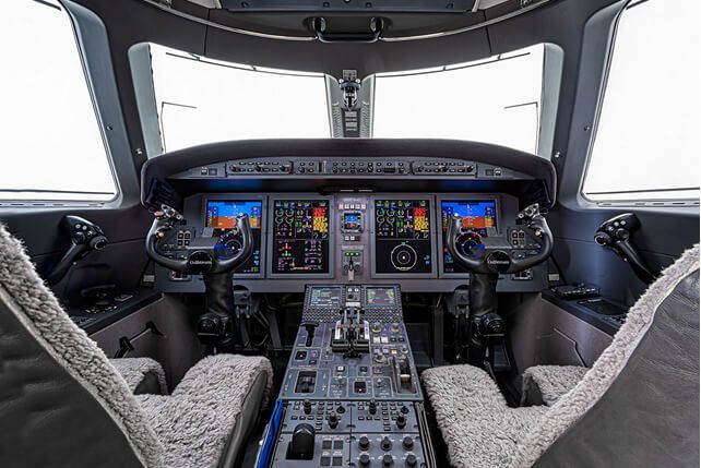 Gulfstream technology in the cockpit enhanced flight crew performance and safety, notably offering the optional Enhanced Vision System (EVS), which uses an infrared camera to display a real-world view to the pilot.